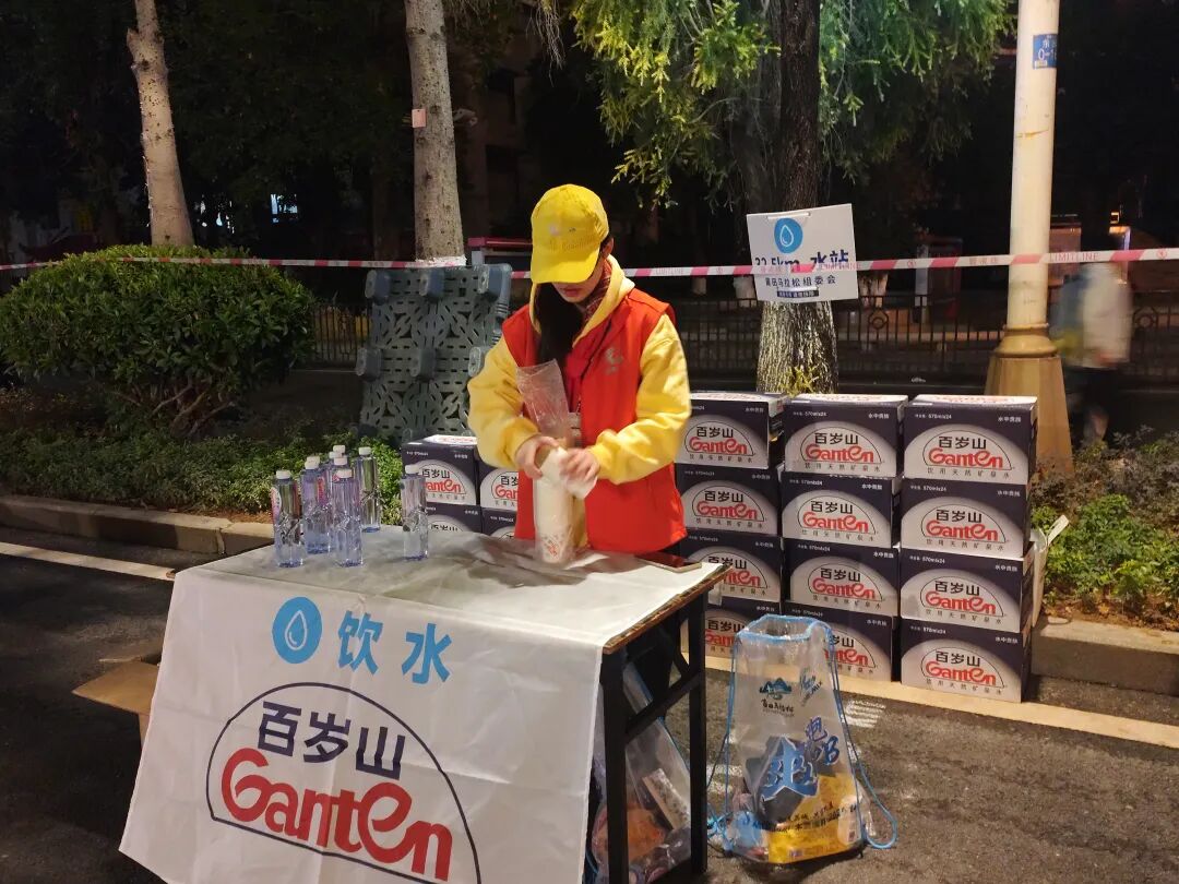 活动当天,凌晨时分,系部志愿者们便已抵达指定岗位,迅速投入赛前准备工作。他们分工协作,认真清点饮用水、能量食品等补给物资,将各类物品摆放得整齐有序。随着参赛选手陆续跑过补给站,志愿者们立刻化身活力满满的“加油团”,高举手臂呐喊助威,用“加油!坚持住!”“你超棒的!”等响亮口号,为选手们注入前行的动力。